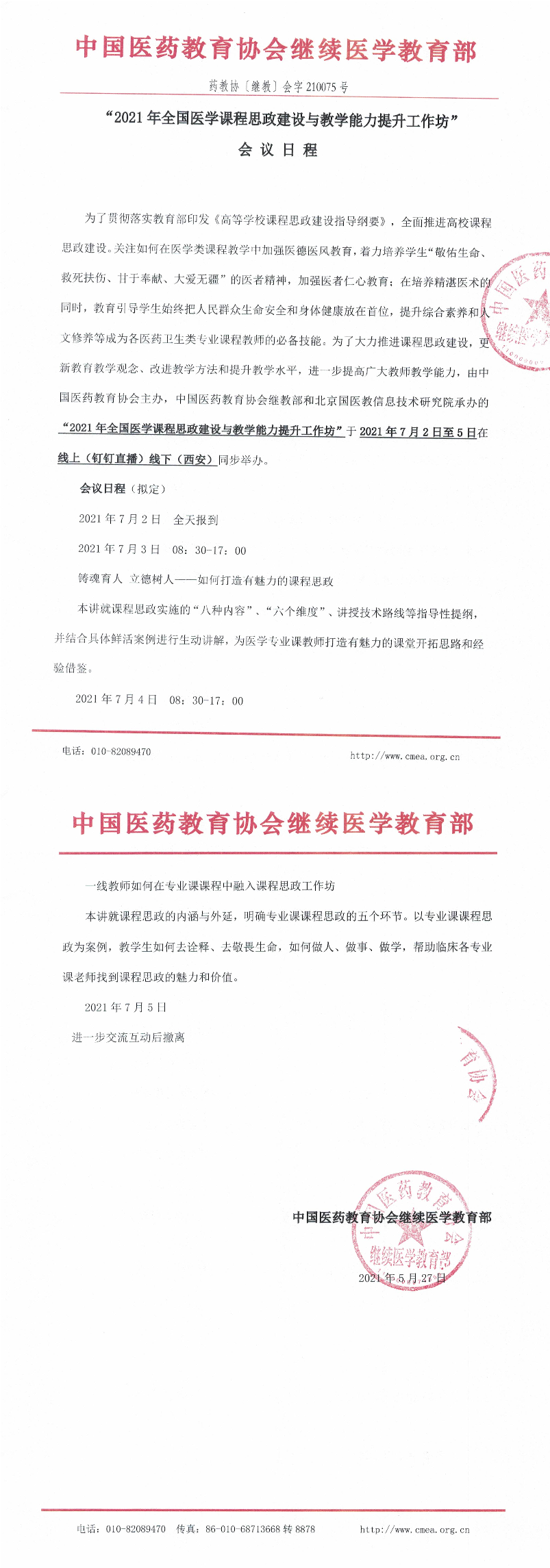 | 药教协[继教]会字-第210075号-2021年全国医学课程思政建设与教学能力提升工作坊-日程-西安 | |||||