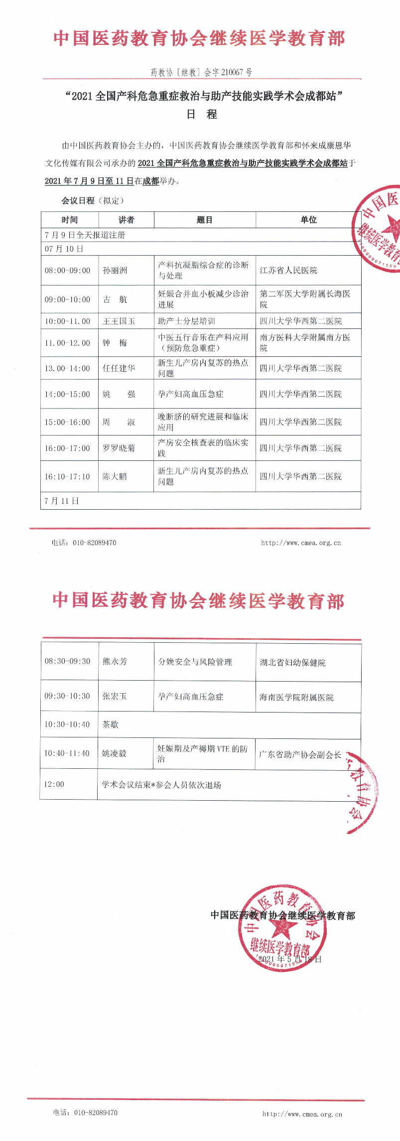 | 药教协[继教]会字-第210067号-2021全国产科危急重症救治与助产技能实践学术会成都站-日程 | |||||