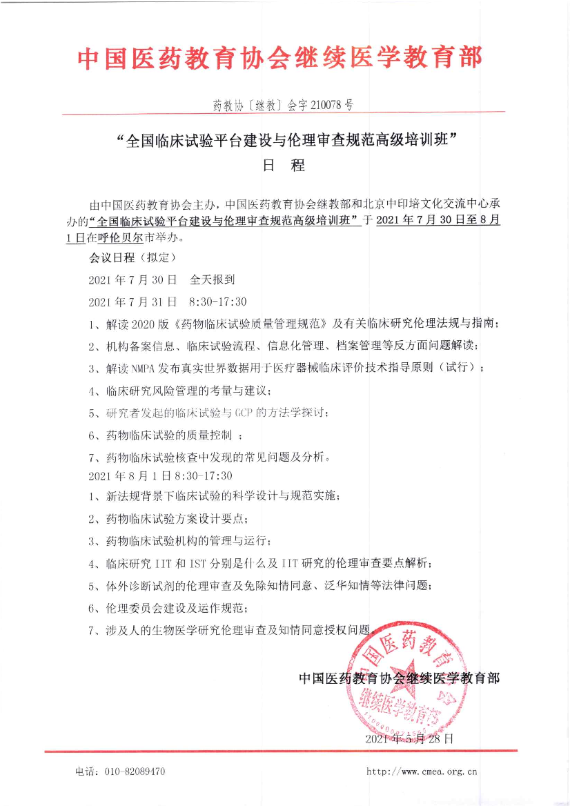 | 药教协[继教]会字-第210078号-国临床试验平台建设与伦理审查规范高级培训班-日程-呼伦贝尔 | |||||
