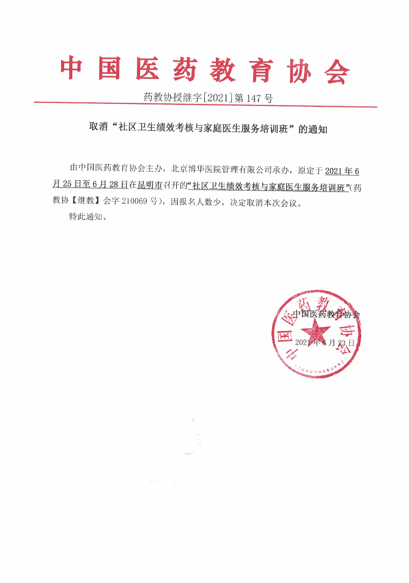 | 药教协授继字[2021]-第147号-社区卫生绩效考核与家庭医生服务培训班取消通知-昆明 | |||||