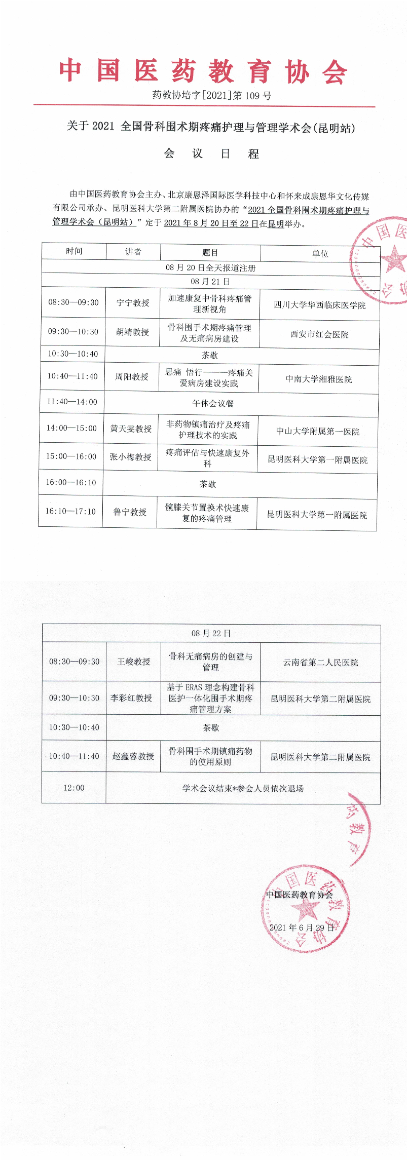 | 药教协培字[2021]-第109号-2021全国骨科围术期疼痛护理与管理学术会-日程-昆明 | |||||