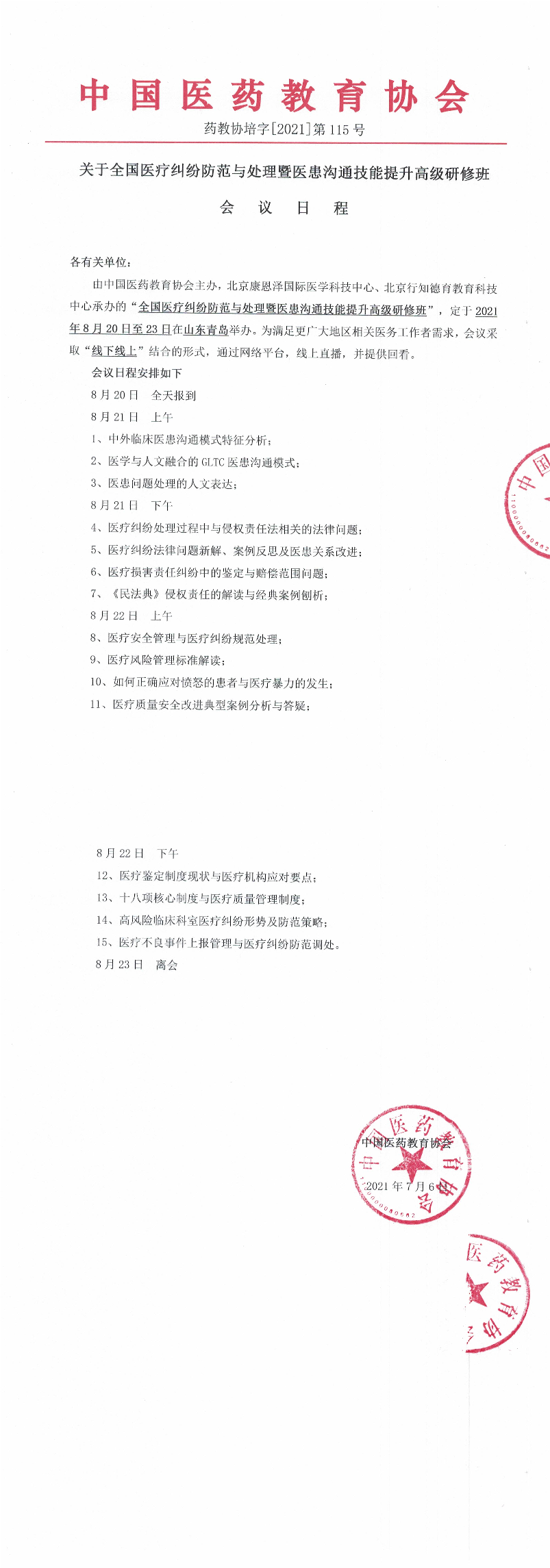 | 药教协培字[2021]-第115号-全国医疗纠纷防范与处理暨医患沟通技能提升高级研修班-日程-青岛 | |||||