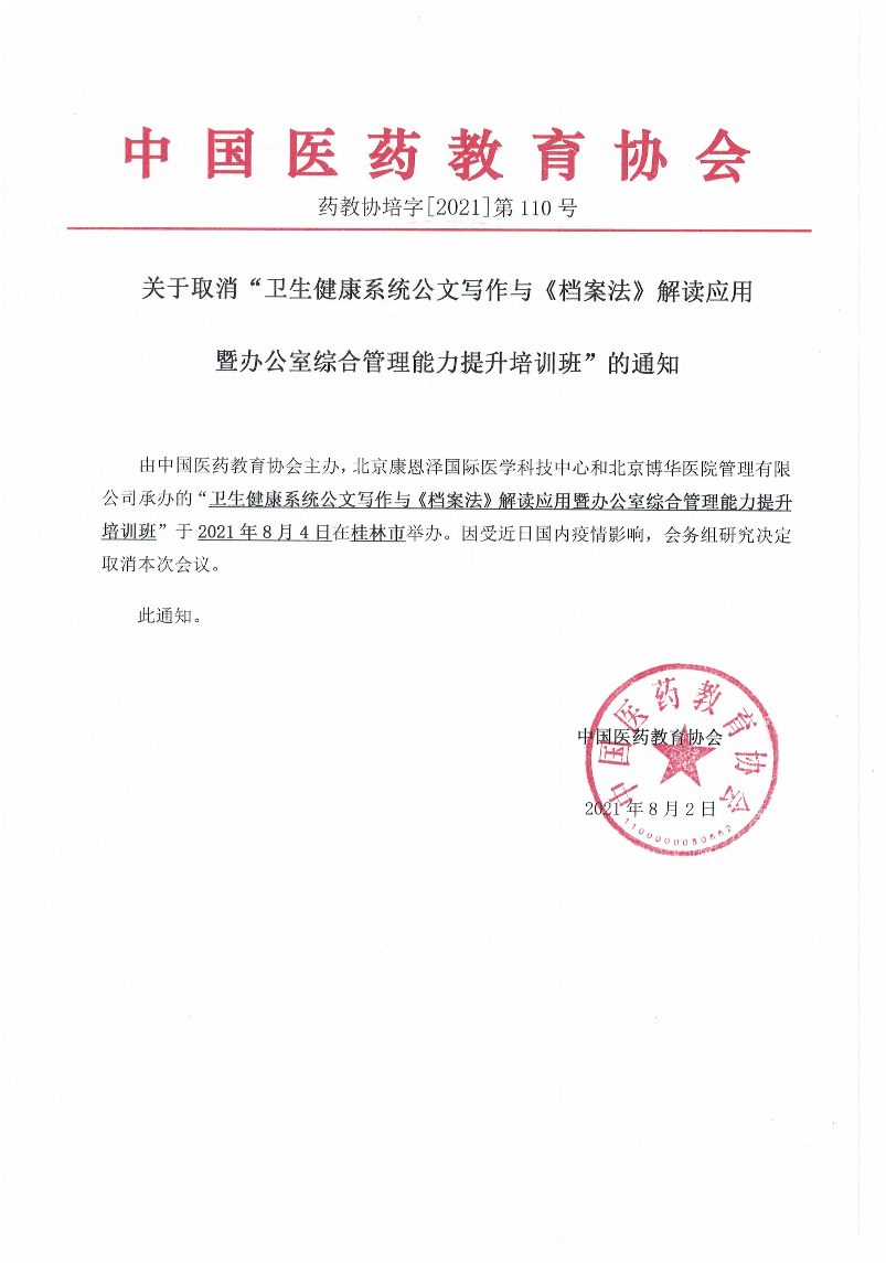 | 药教协培字[2021]-第110号-药教协培字[2021]-第110号-卫生健康系统公文写作与《档案法》解读应用暨办公室综合管理能力提升培训班取消通知 | |||||