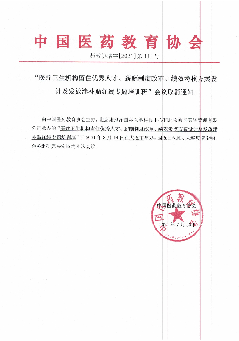 | 药教协培字[2021]-第111号-药教协培字[2021]-第111号-医疗卫生机构留住优秀人才、薪酬制度改革、绩效考核方案设计及发放津补贴红线专题培训班取消通知 | |||||
