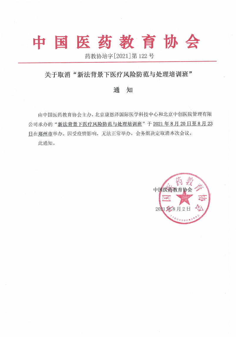| 药教协培字[2021]-第122号-药教协培字[2021]-第122号-新法背景下医疗风险防范与处理培训班取消通知 | |||||
