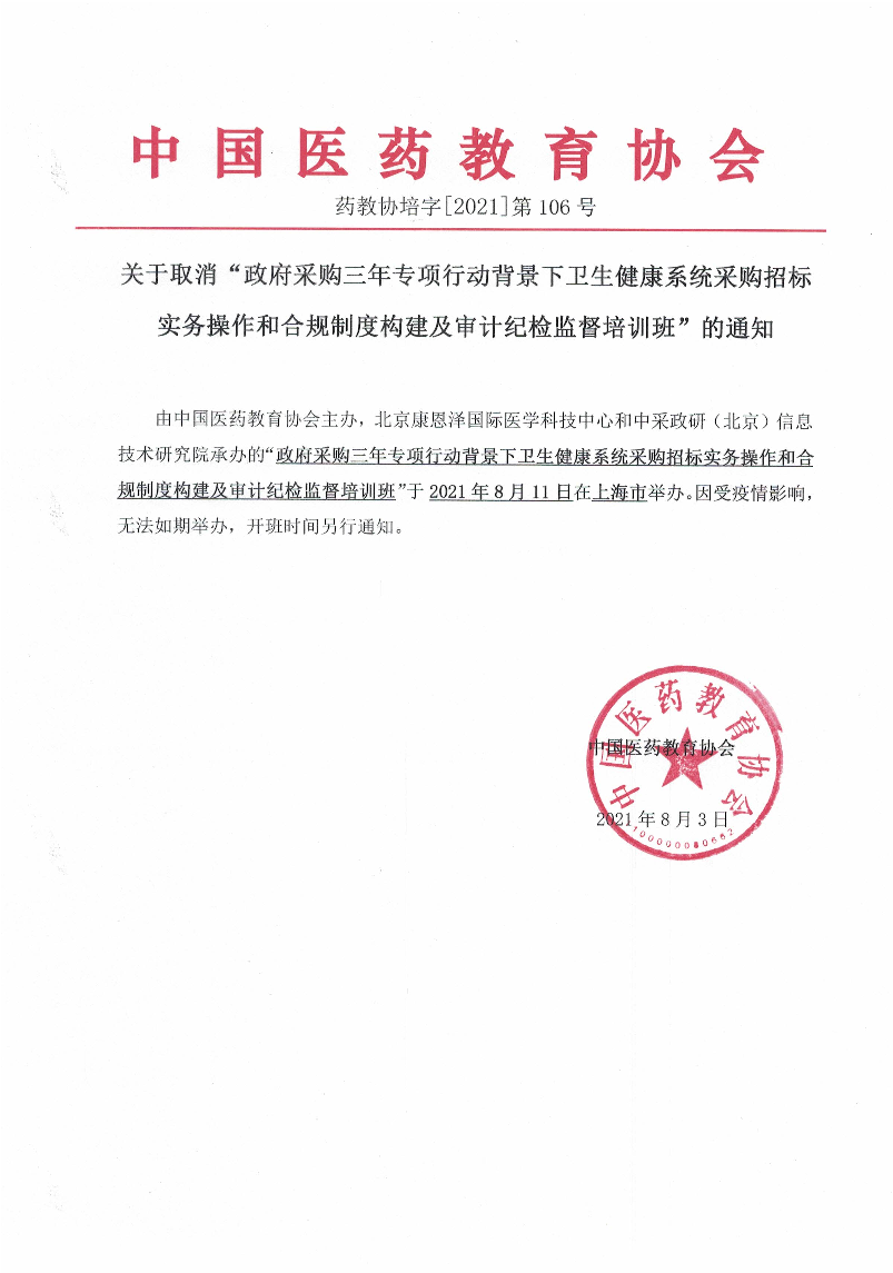 | 药教协培字[2021]-第106号-药教协培字[2021]-第106号-政府采购三年专项行动背景下卫生健康系统采购招标实务操作和合规制度构建及审计纪检监督培训班取消通知 | |||||