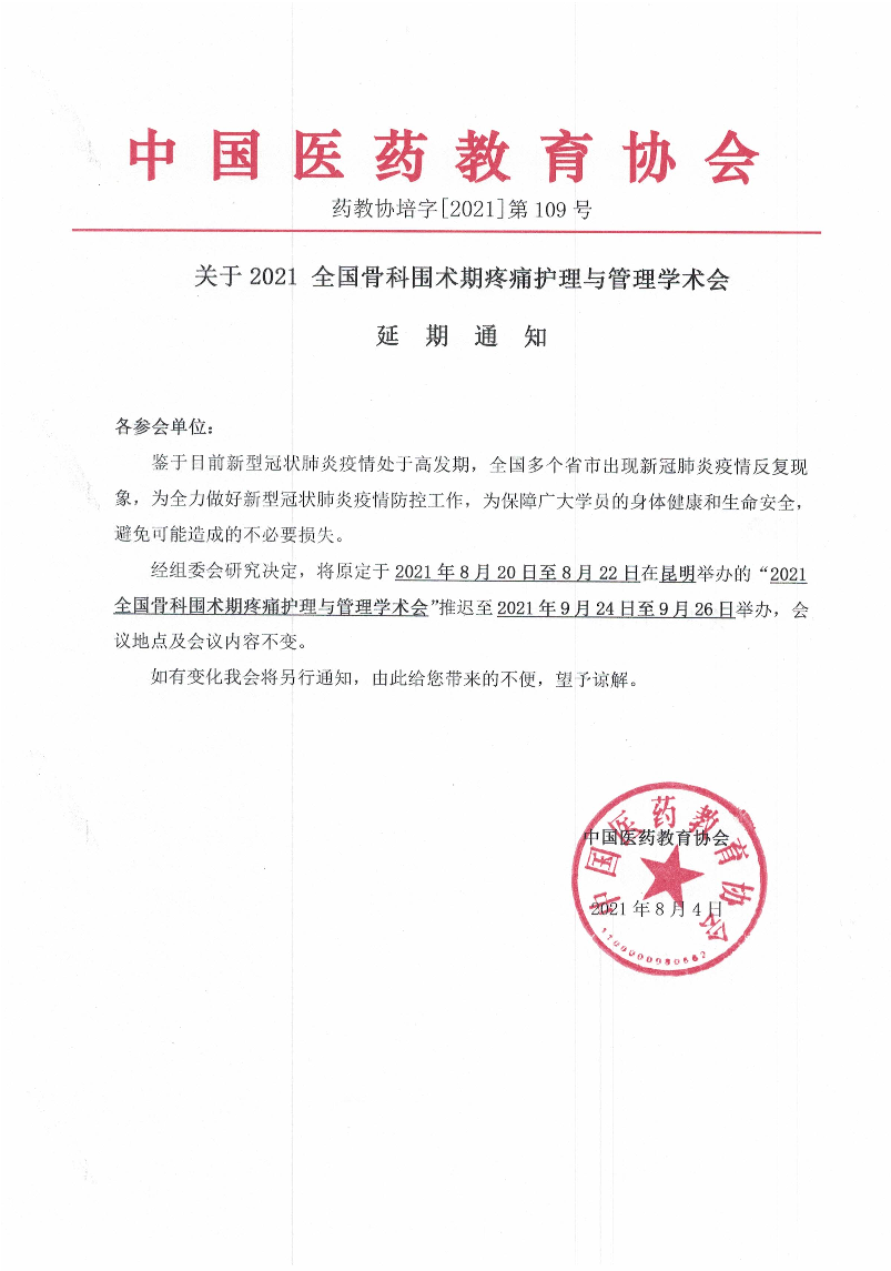 | 药教协培字[2021]-第109号-药教协培字[2021]-第109号-2021全国骨科围术期疼痛护理与管理学术会(昆明)延期通知 | |||||