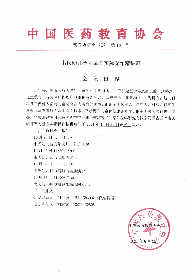 | 药教协培字[2021]-第137号-2-药教协培字【2021】第137号-韦氏幼儿智力量表实际操作精讲班-日程-线上 | |||||