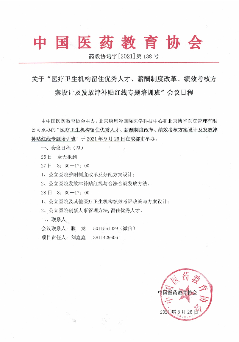 | 药教协培字[2021]-第138号-药教协培字【2021】第138号-医疗卫生机构留住优秀人才、薪酬制度改革、绩效考核方案设计及发放津补贴红线专题培训班-日程-成都 | |||||