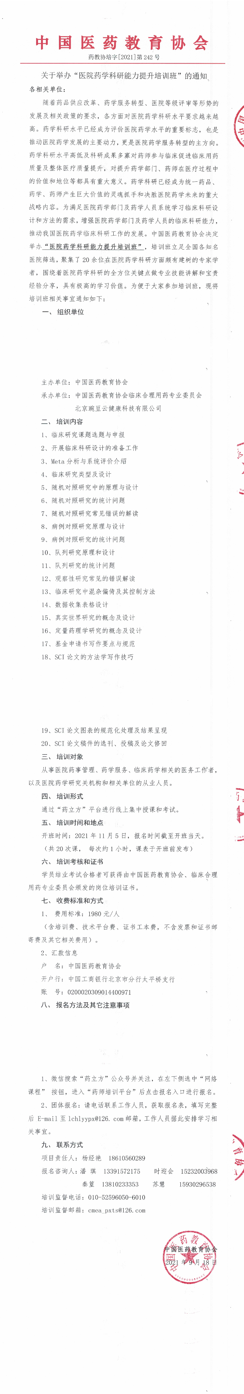 | 药教协培字[2021]-第242号-药教协字242-关于举办2021医院药学科研能力提升培训班通知 | |||||