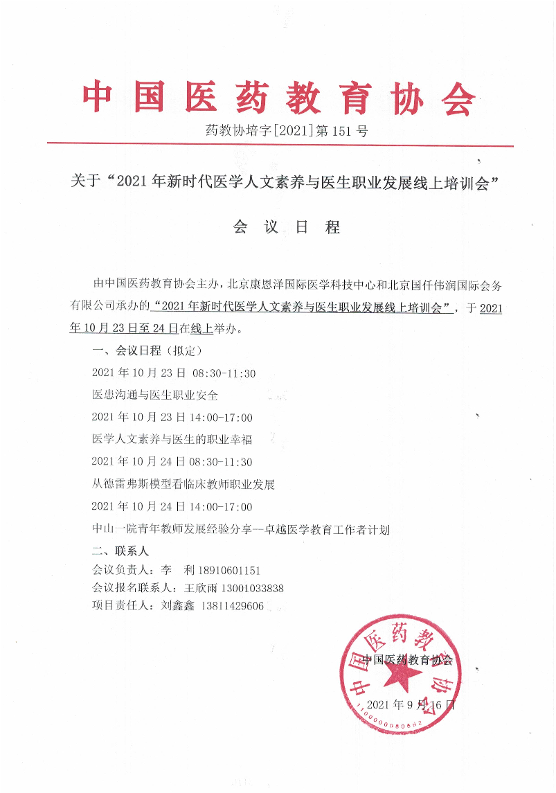 | 药教协培字[2021]-第151号-药教协培字【2021】第151号-2021年新时代医学人文素养与医生职业发展线上培训会-会议日程-线上 | |||||