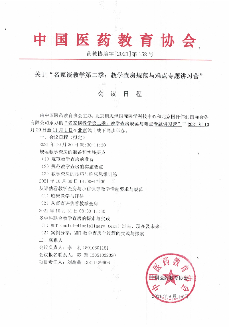 | 药教协培字[2021]-第152号-药教协培字【2021】第152号-名家谈教学第二季:教学查房规范与难点专题讲习营-会议日程-北京 | |||||
