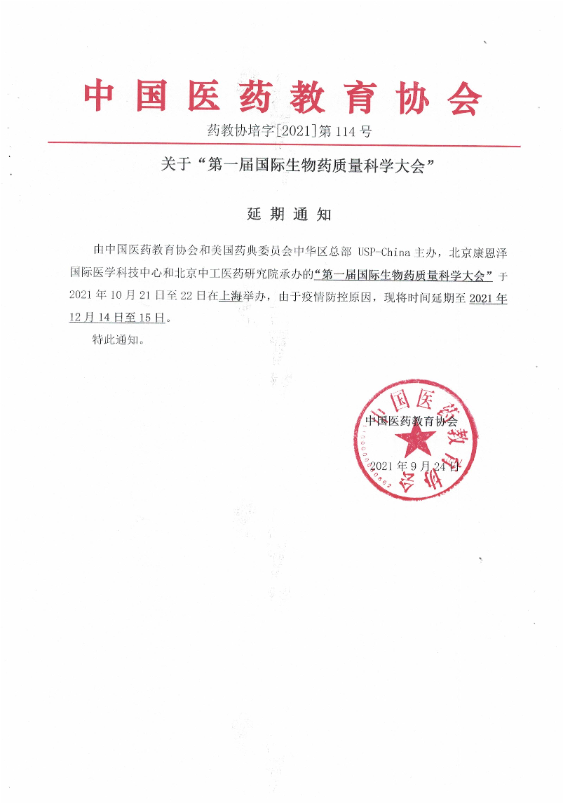 | 药教协培字[2021]-第114号-药教协培字【2021】第114号-第一届国际生物药质量科学大会-延期通知 | |||||