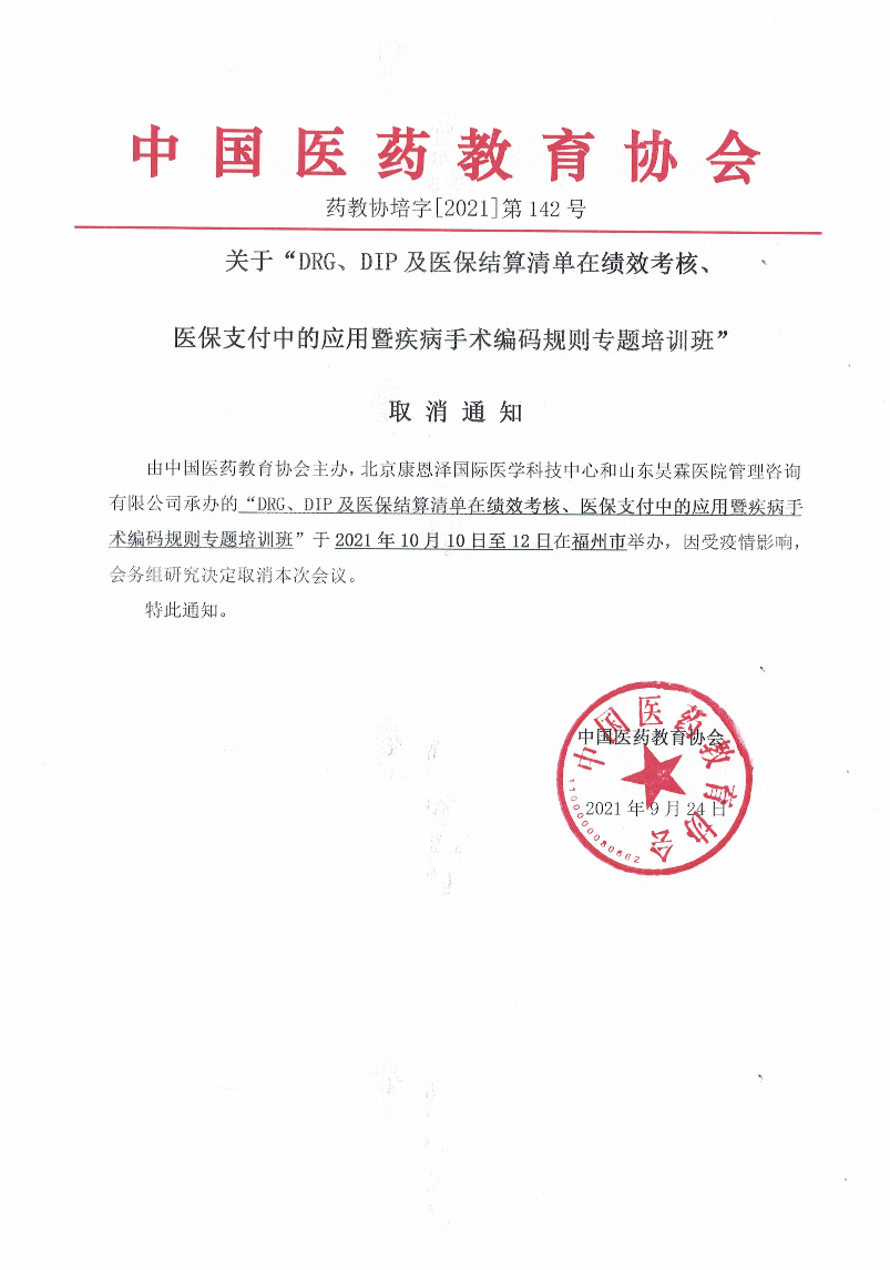 | 药教协培字[2021]-第142号-药教协培字【2021】第142号-DRG、DIP及医保结算清单在绩效考核、医保支付中的应用暨疾病手术编码规则专题培训班-取消通知 | |||||
