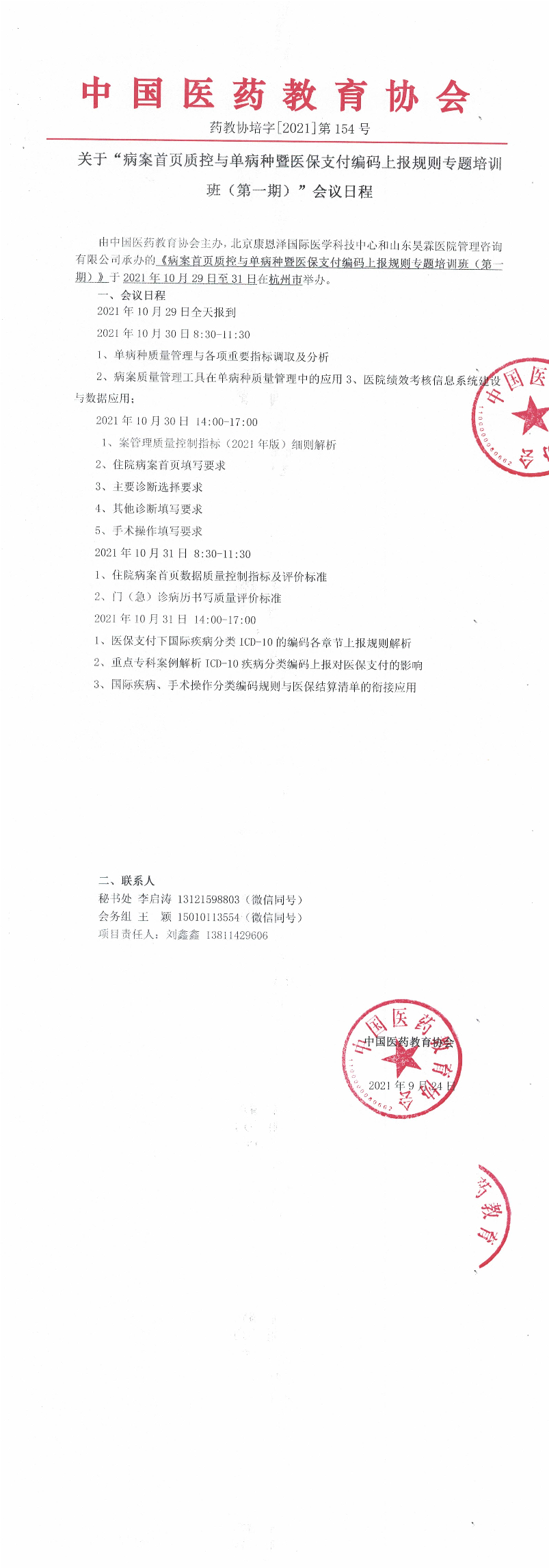 | 药教协培字[2021]-第154号-药教协培字【2021】第154号-病案首页质控与单病种暨医保支付编码上报规则专题培训班(第一期)-会议日程-杭州 | |||||