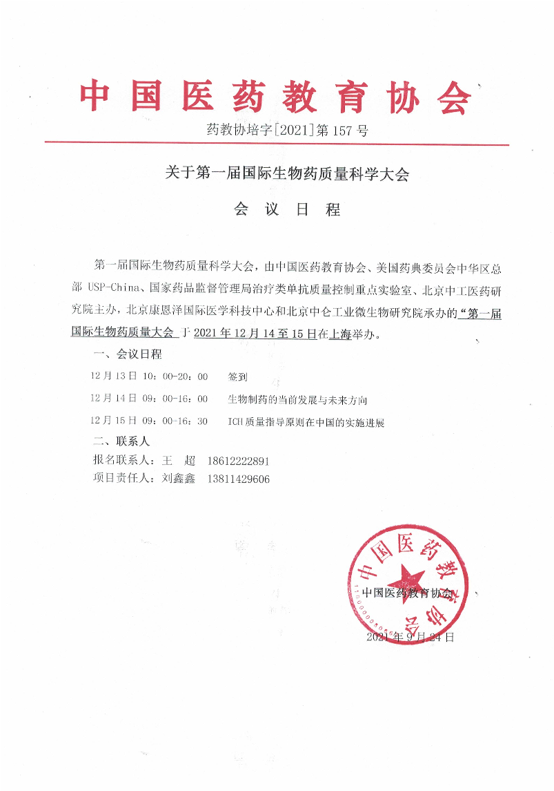 | 药教协培字[2021]-第157号-药教协培字【2021】第157号-第一届国际生物药质量科学大会-会议日程-上海 | |||||