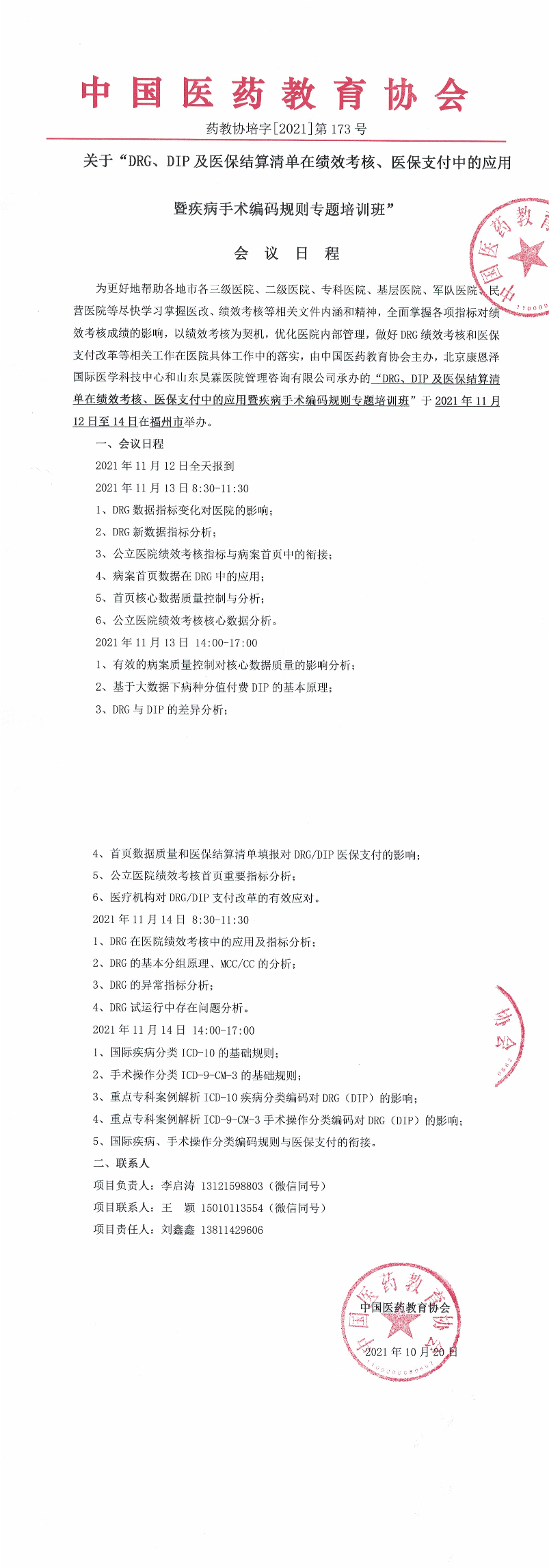 | 药教协培字[2021]-第173号-药教协培字【2021】第173号-DRG、DIP及医保结算清单在绩效考核、医保支付中的应用暨疾病手术编码规则专题培训班-日程-福州 | |||||