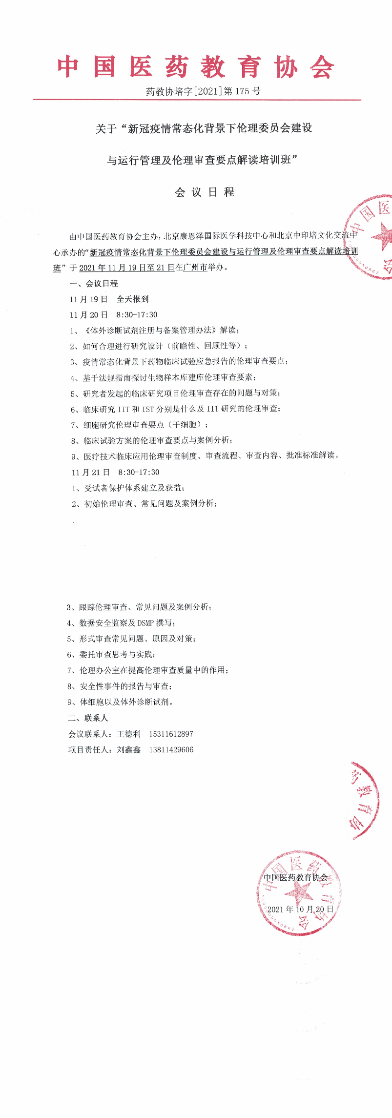 | 药教协培字[2021]-第175号-药教协培字【2021】第175号-新冠疫情常态化背景下伦理委员会建设与运行管理及伦理审查要点解读培训班-日程-广州 | |||||