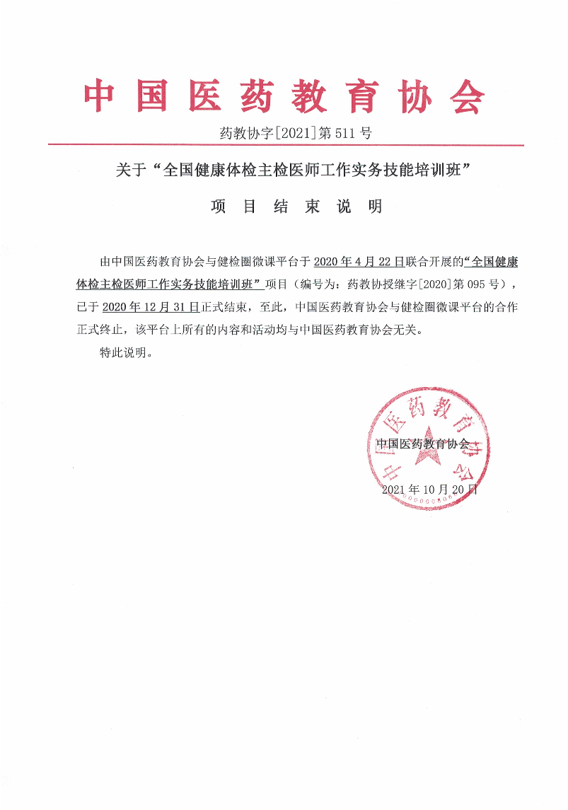 | 药教协【2021】-第511号-药教协字【2021】第511号-全国健康体检主检医师工作实务技能培训班-项目结束说明 | |||||
