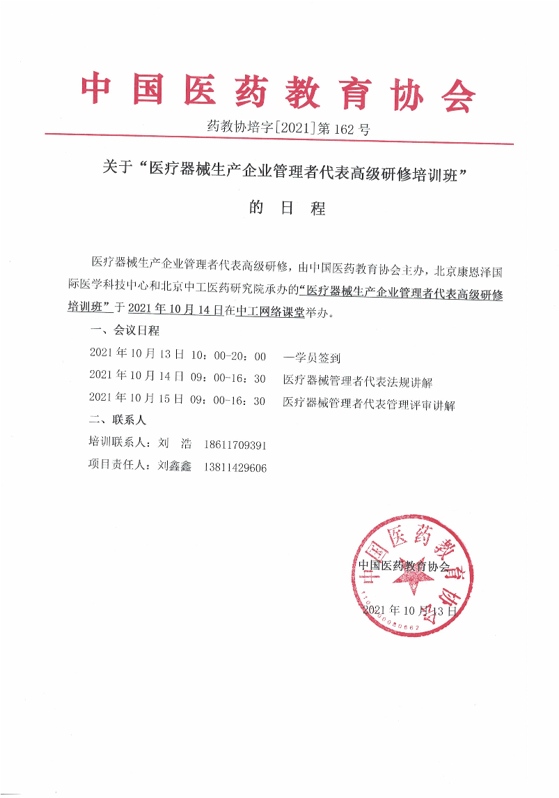| 药教协培字[2021]-第162号-药教协培字【2021】第162号-医疗器械生产企业管理者代表高级研修培训班-日程-中工网络课堂 | |||||