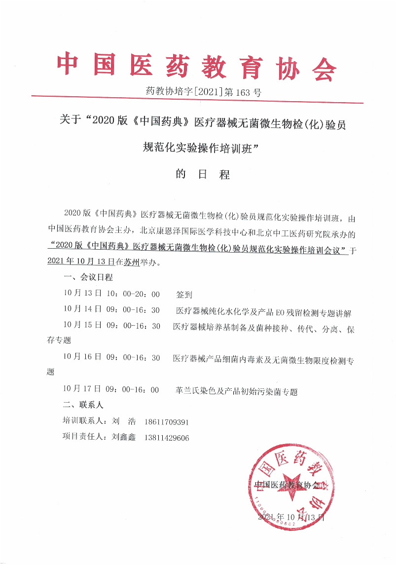 | 药教协培字[2021]-第163号-药教协培字【2021】第163号-2020版《中国药典》医疗器械无菌微生物检(化)验员规范化实验操作培训班-日程-苏州 | |||||
