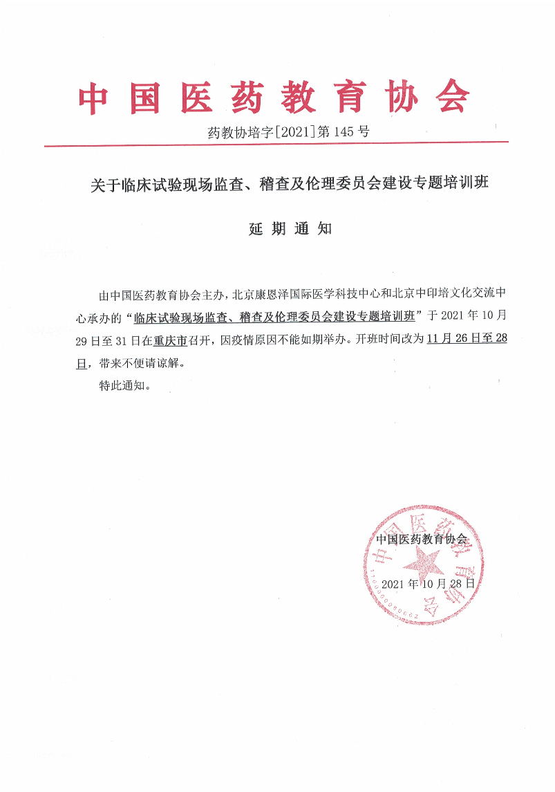 | 药教协培字[2021]-第145号-药教协培字【2021】第145号-临床试验现场监查、稽查及伦理委员会建设专题培训班-延期通知 | |||||
