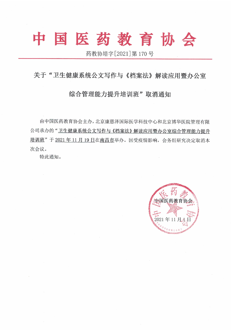| 药教协培字[2021]-第170号-药教协培字【2021】第170号-卫生健康系统公文写作与《档案法》解读应用暨办公室综合管理能力提升培训班-南昌-取消通知 | |||||