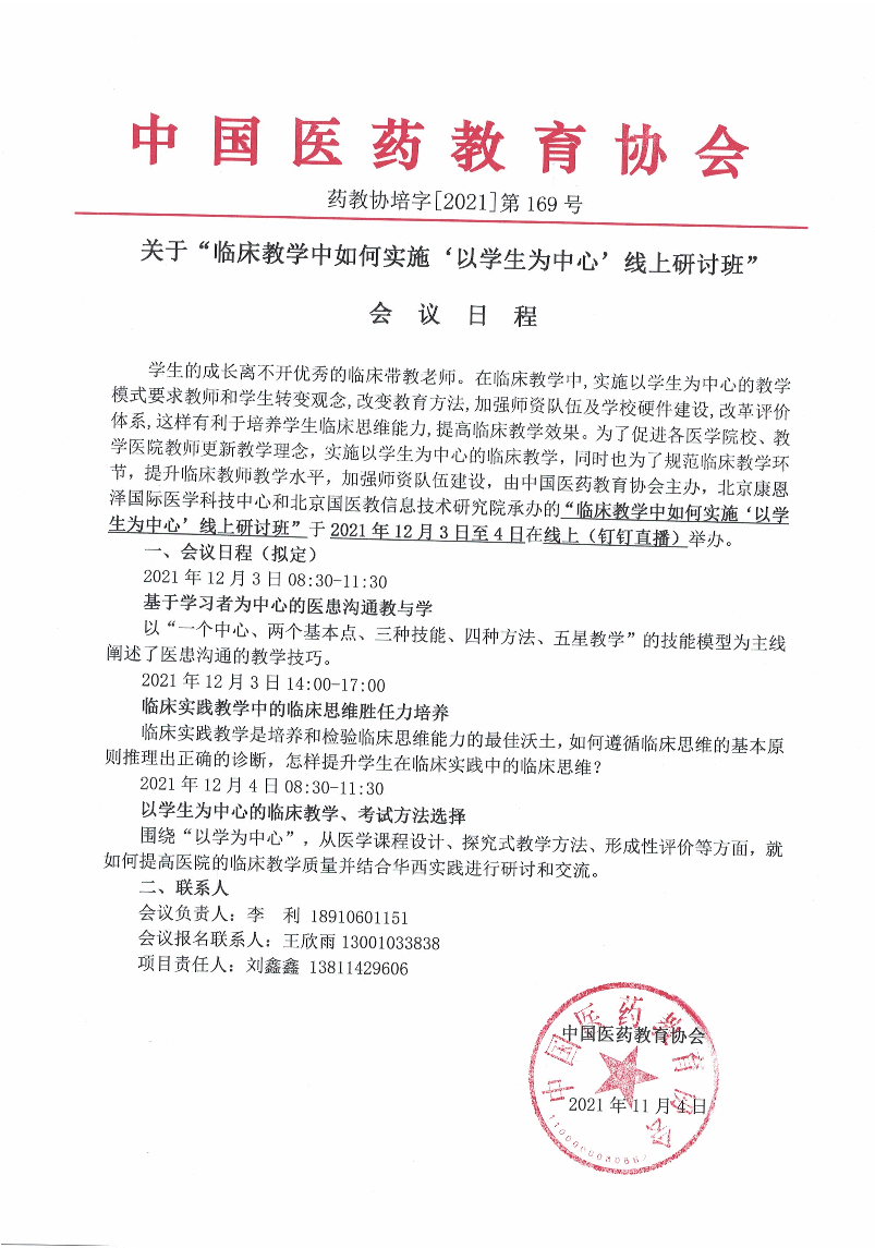 | 药教协培字[2021]-第169号-药教协培字【2021】第169号-临床教学中如何实施‘以学生为中心’线上研讨班-会议日程 | |||||