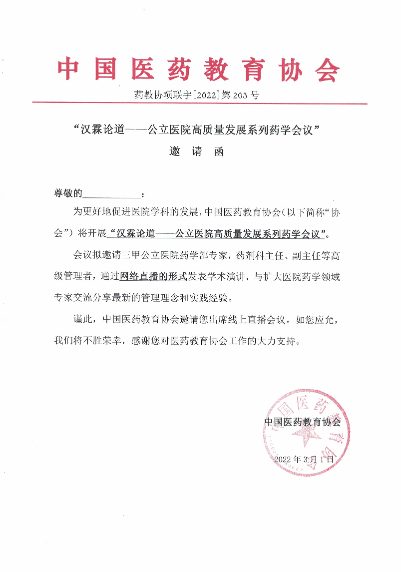 | 药教项联【2022】-第203号-药教协项联字203号--汉霖论道——公立医院高质量发展系列药学会议 | |||||