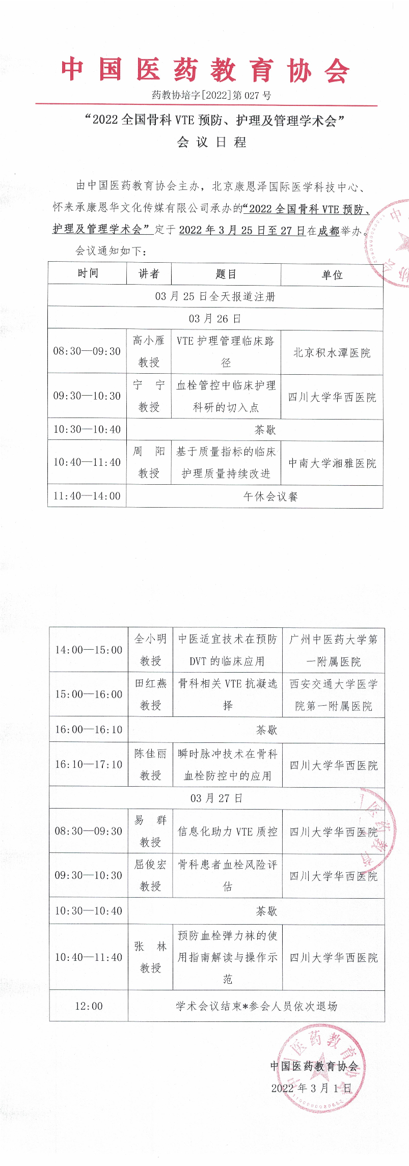 | 药教协培[2022]-第27号-药教协培字[2022]第027号-“2022全国骨科VTE预防、护理及管理学术会”会议日程 | |||||