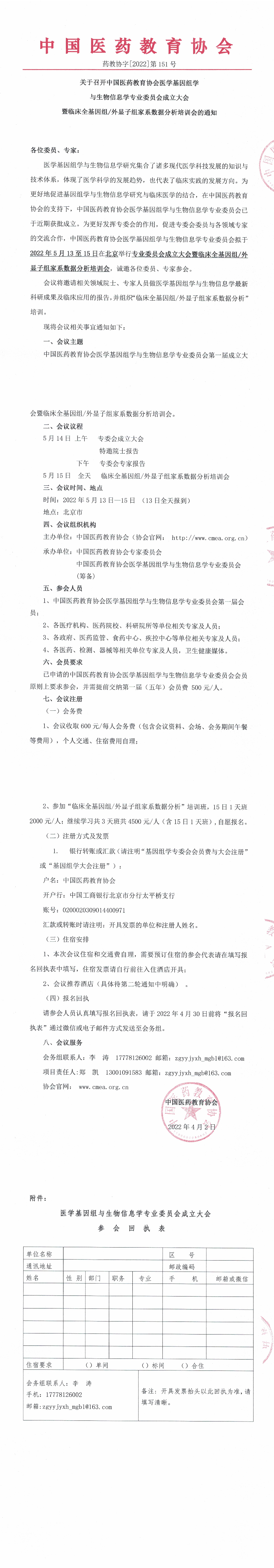 | 药教协[2022]-第151号-关于召开中国医药教育协会医学基因组学与生物信息学专业委员会成立大会暨临床全基因组外显子组家系数据分析培训会的通知 | |||||