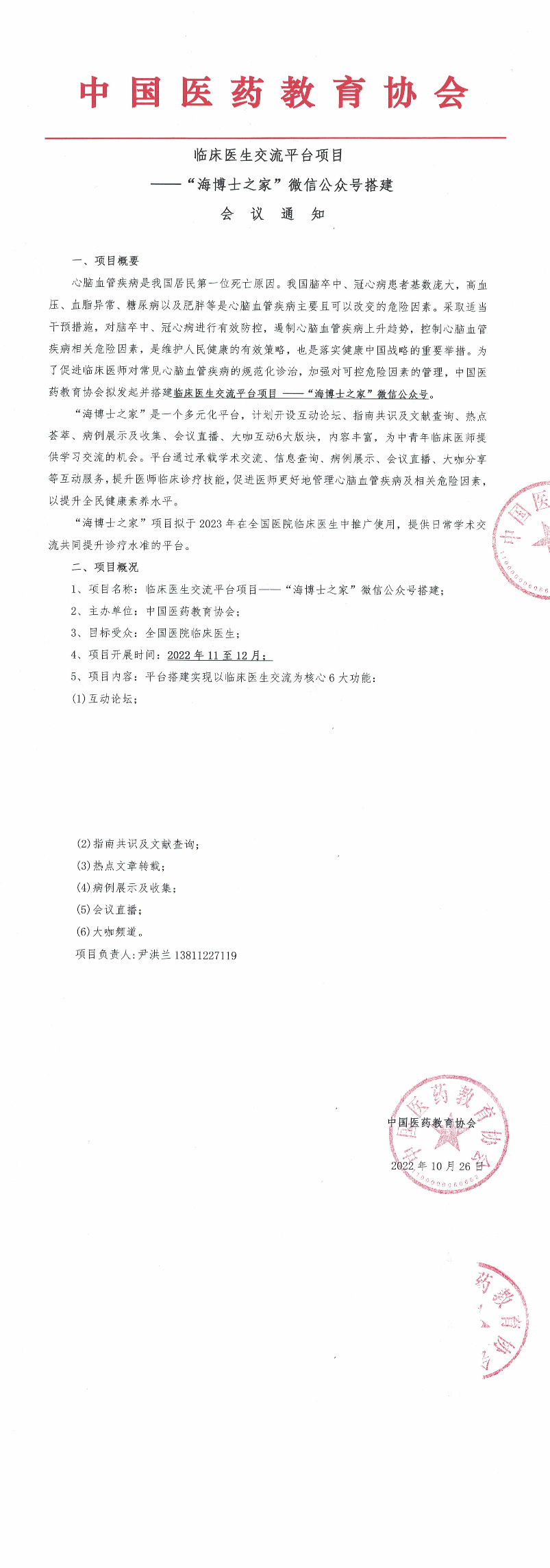 | 药教协[2022]-第1027号-临床医生交流平台项目-“海博士之家”微信公众号搭建-会议通知 | |||||