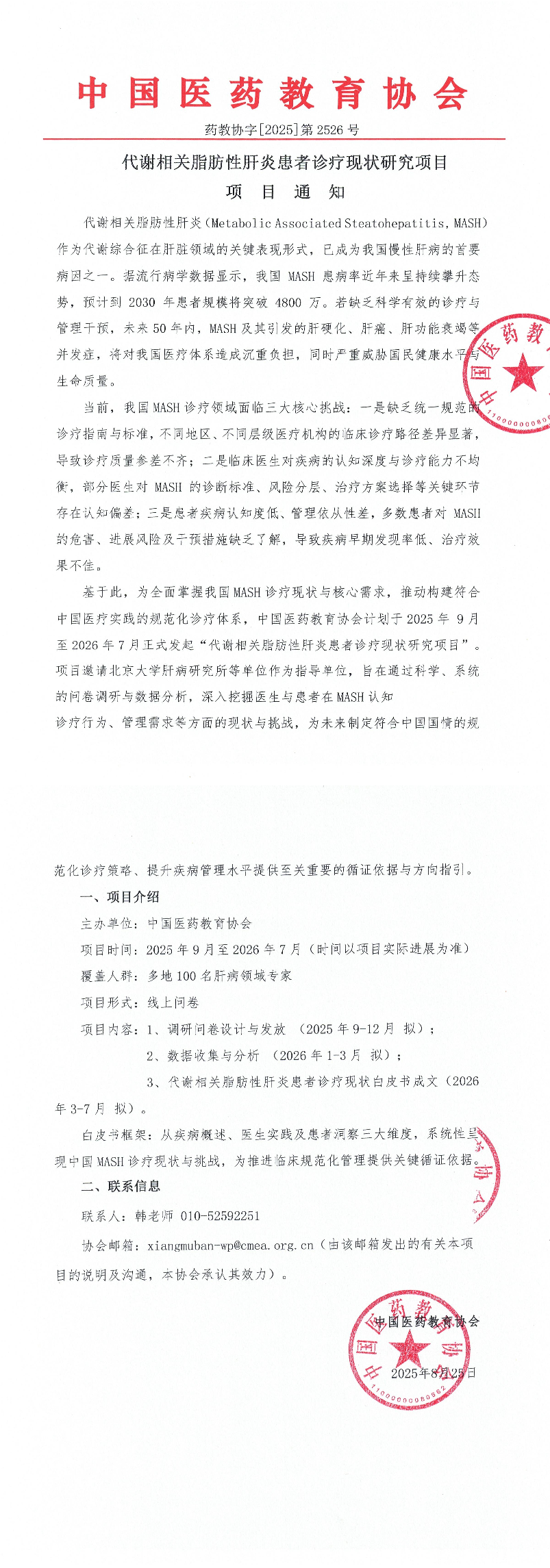 药教协字【2025】-第2526号-代谢相关脂肪性肝炎患者诊疗现状研究项目通知 | |||||