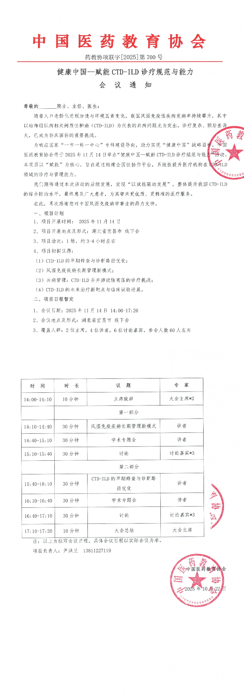 | 药教协项联字【2025】-第700号-健康中国一赋能CTD-ILD诊疗规范与能力会议通知 | |||||