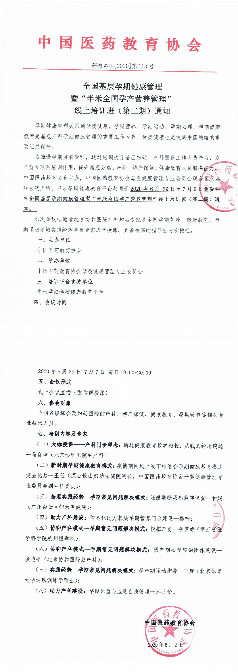 | 药教协授字[2020]-第113号-全国基层孕期健康管理暨“半米全国孕产营养管理通知 | |||||