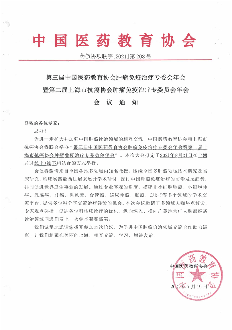 | 药教协项联字[2021]-第208号-第三届中国医药教育协会肿瘤免疫治疗专委会年会暨第二届上海市抗癌协会肿瘤免疫治疗专委员会年会会议通知 | |||||
