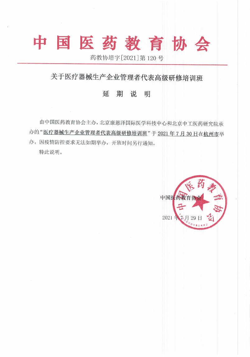 | 药教协培字[2021]-第120号-医疗器械生产企业管理者代表高级研修培训班-延期说明 | |||||