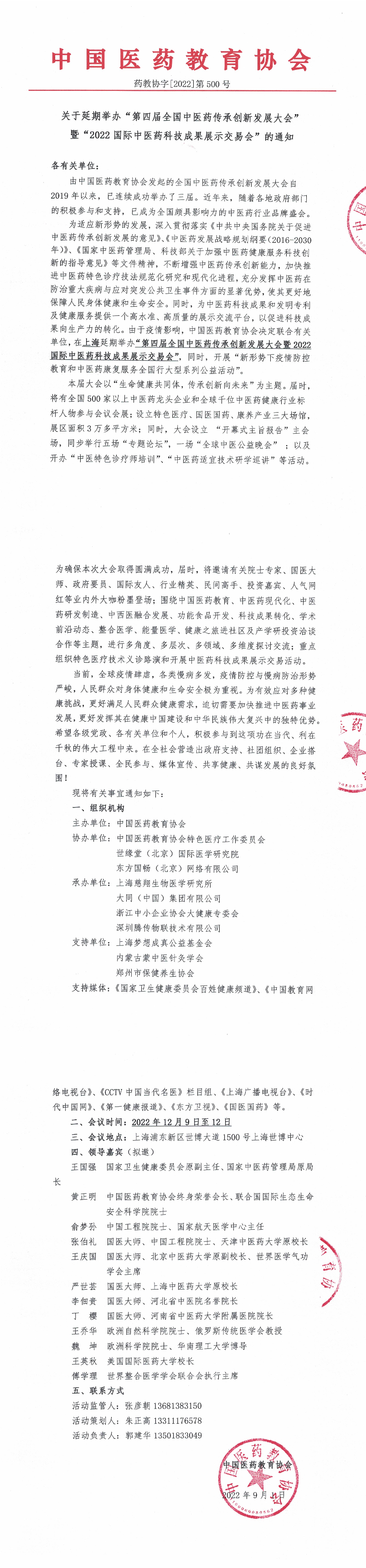 | 药教协[2022]-第500号-关于延期举办“第四届全国中医药传承创新发展大会”暨“2022国际中医药科技成果展示交易会”的通知 | |||||